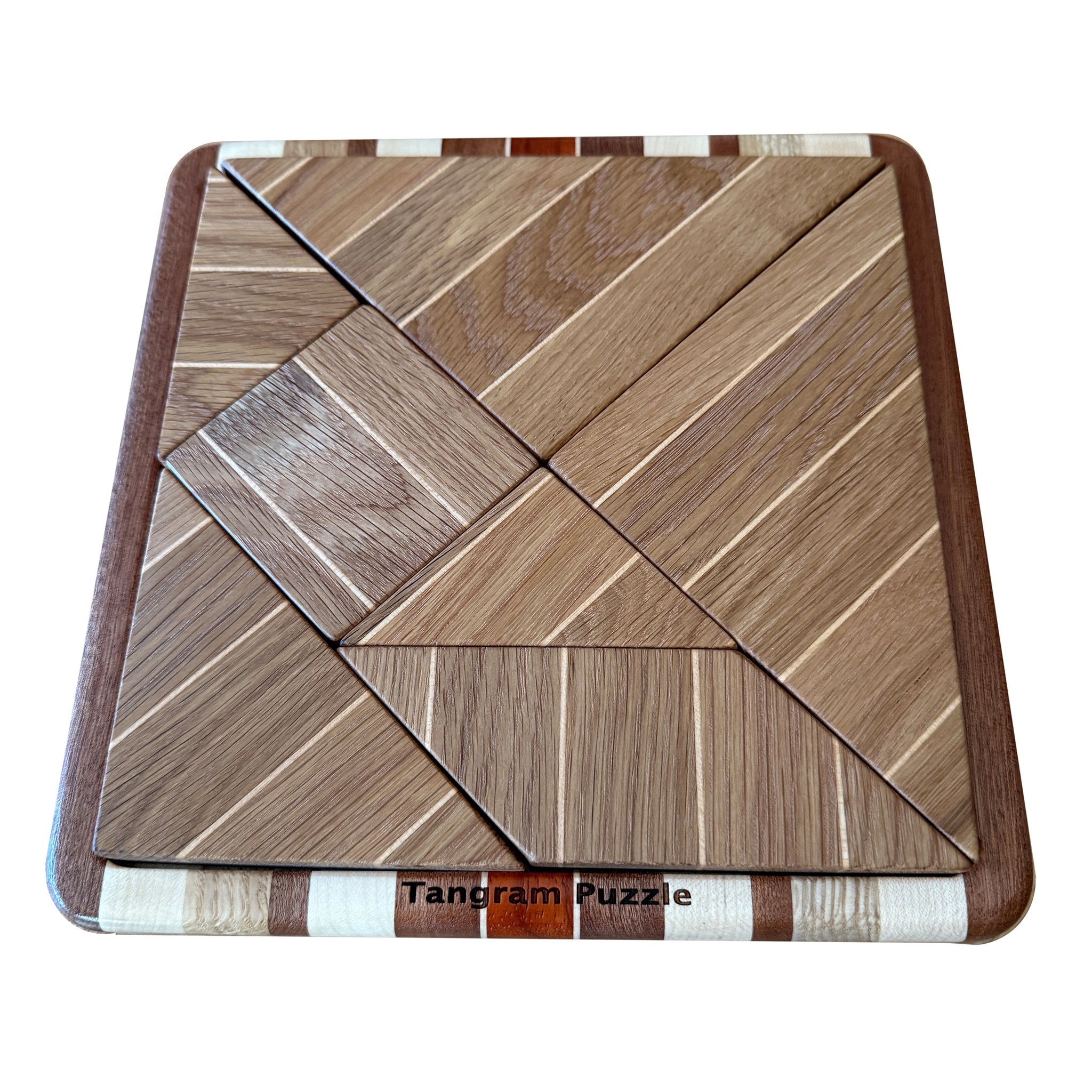 Each set is made by hand in my workshop studio from select hardwoods such as maple, walnut, padauk, sapele, birch, white oak and cherry. The natural grain of the wood gives every puzzle its own character. Precision shaping and a smooth, durable finish of mineral oil ensures the pieces fit beautifully together and feel wonderful in your hand. The finish of the pieces is a non toxic mineral oil. The Tangram is more than a pastime–it’s a tool for learning, relaxation and inspiration. It sharpens spatial reasoning and problem-solving, offers a calming, screen-free escape and doubles as a sculptural accent when displayed on a desk or coffee table.